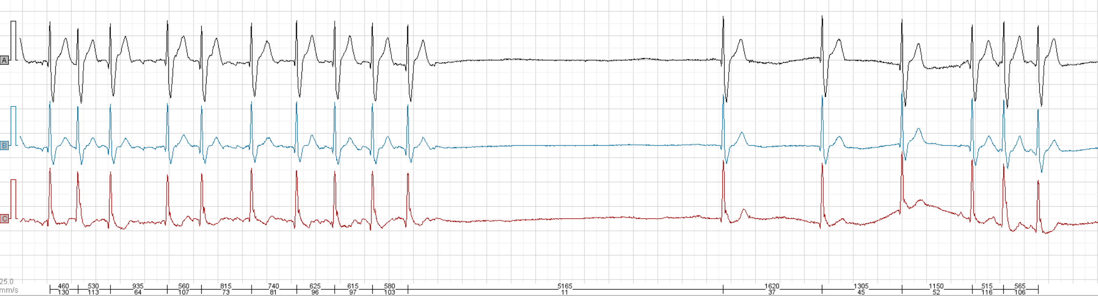 asistolă urmată de reluare activitate atrială, ulterior și activitate ventriculară cu BAV grd II inițial; pacient tânăr, cu sincope;